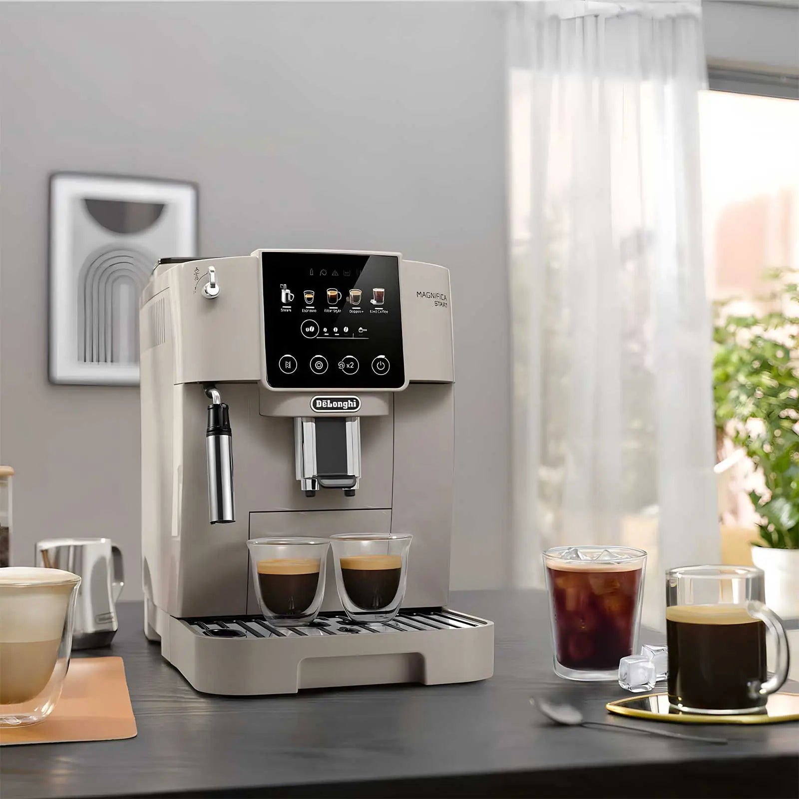 Magnifica Start POP vous offre tout ce dont vous avez besoin pour préparer vos boissons préférées à base d’espresso chez vous. Elle est équipée de la technologie exclusive LatteCrema Hot pour recouvrir vos boissons d’une fine et riche mousse de lait, et propose une sélection de recettes accessibles d’une simple pression sur un bouton.