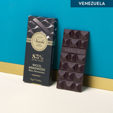 Découvrez la tablette Venezuela 85 % – 70 g de Venchi, un chocolat noir d'origine unique, élaboré à partir de fèves de cacao du Venezuela, réputées pour leur finesse et leur intensité aromatique.